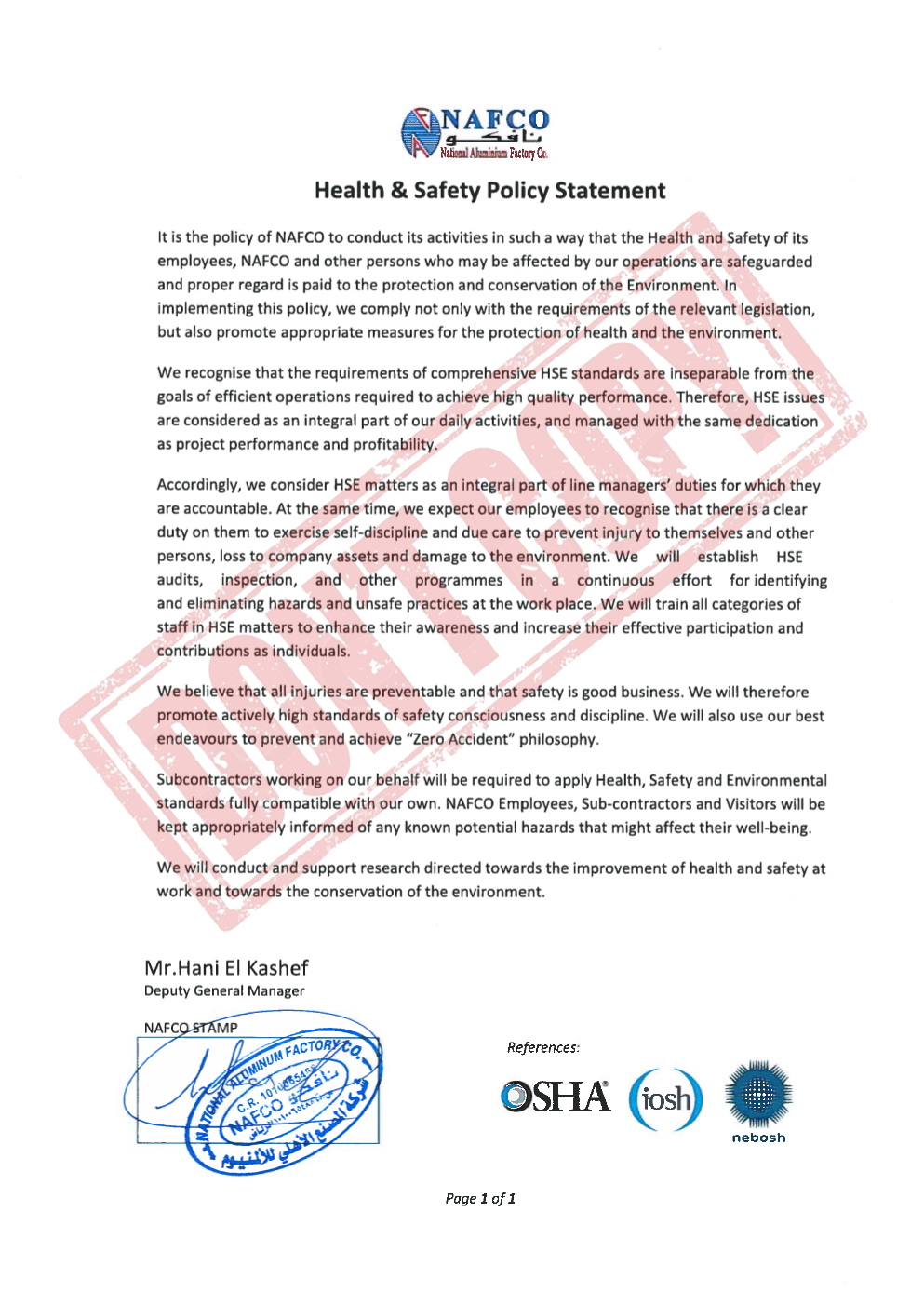 It is the policy of NAFCO to Conduct its activities in such a way that the Health and Saftety of this employees, NAFCO and other person who may be affected by our operations are safeguarded and proper regard is paid to the production and conservation of the Environment. In implementing this policy, we comply not only with the requirements of the relevant legislation but also promote appropriate measures for the production of health and the environment.