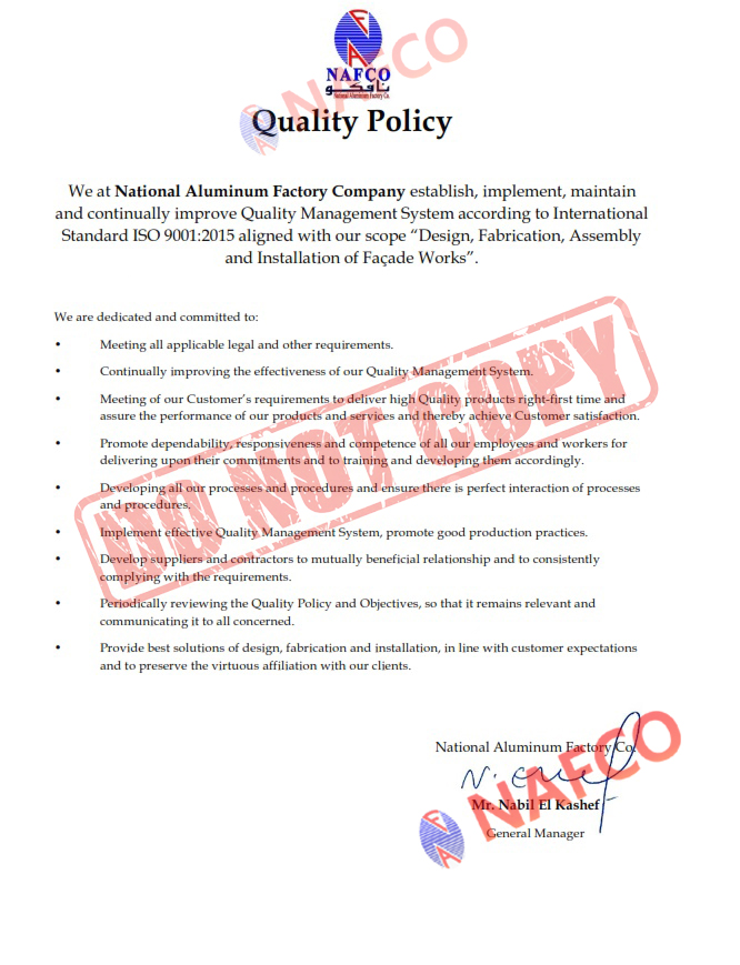 We at National Aluminum Factory Company establish, implement, maintain and continually improve Quality Management System according to International Standard ISO 9001:2015 aligned with our scope “Design, Fabrication, Assembly and Installation of Façade Works”.