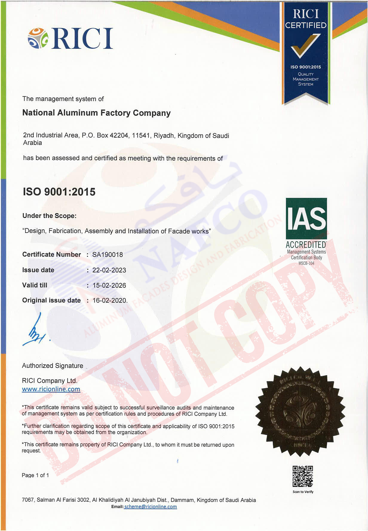 Under the scope: "Design, Fabrication, Assembly and Installation of Facade Works.". Certificate Number: SA190018. Issue Date: 16th February 2020. Valid Till: 15th February 2023.